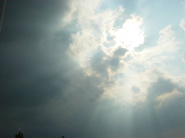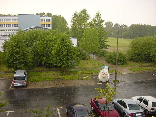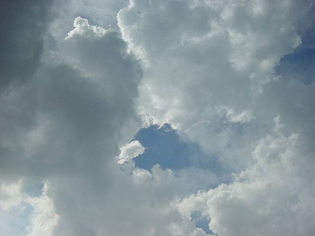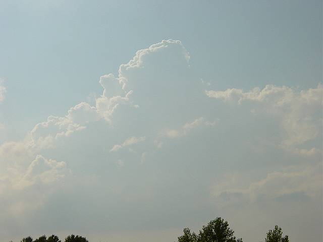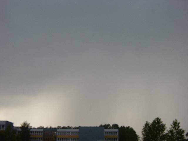 Am späten Vormittag begannen schon erste Cumulus-Wolken fast senkrecht in den Himmel zu wachsen, denn es war sehr windstill. Es wurde nun auch zunehmend schwüler, und man konnte förmlich das Gewitterpotential spüren. Gegen Mittag kam der erste Schauer, bei dem es schön sehr stark regnete, siehe das 5. Foto vom Niederschlagsfallstreifen. Dieser Schauer verstärkte sich (erkennbar an den starken Quellungen an der Rückseite, siehe Bild 6) und zog nun weiter nach Nordost ab. |