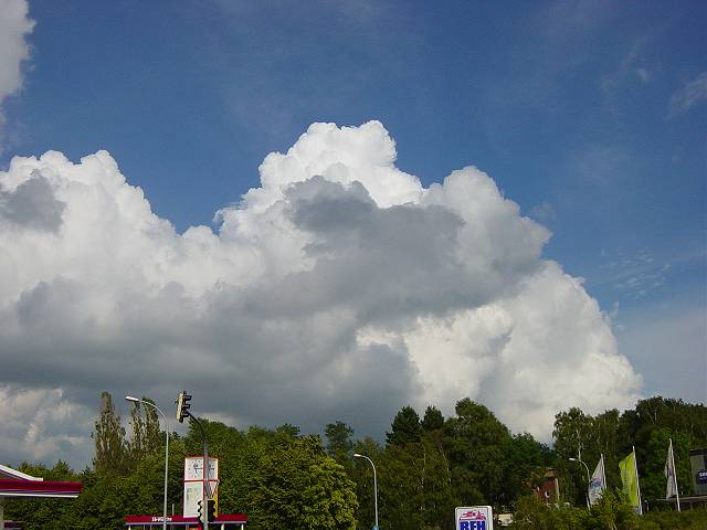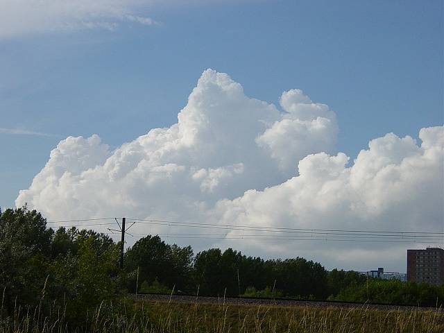Am späten Nachmittag ging es mit den Quellungen am Himmel weiter, jedoch nicht mehr ganz so stark. Durch die niedriger stehende Sonne bekamen die Cumulus-Wolken nun eine sehr schön strahlende Oberfläche. Siehe das 1. bis 4. Foto. Gegen 20:00 Uhr kam dann noch eine weitere Zelle, die aber nicht mehr so heftig war wie die am Nachmittag. Das stärkste Niederschlagsfeld ging im Rostocker Süden runter, bei mir grummelte es zwei, drei mal und dann zog die Zelle unter Abschwächung weiter. |