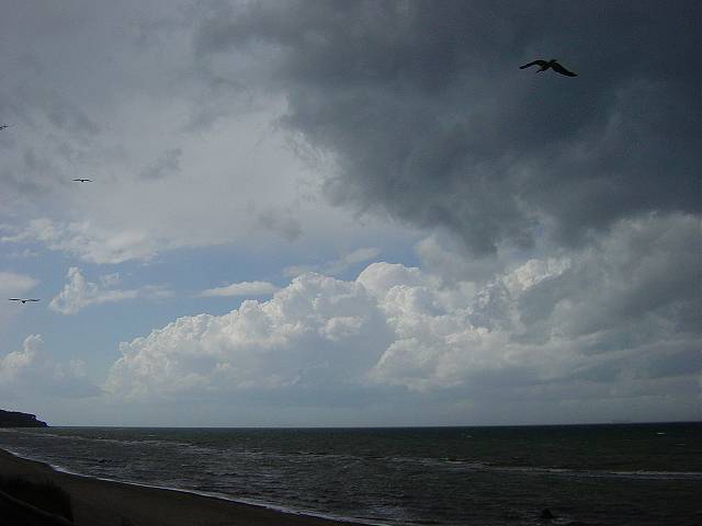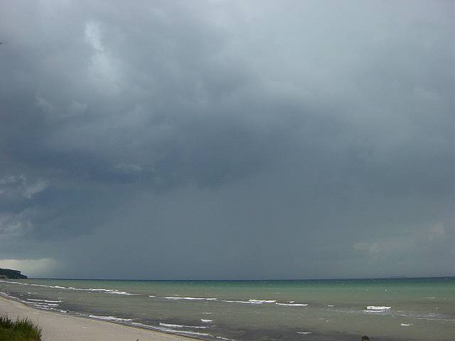 Die ersten beiden Bilder entstanden am Abend des Vortages. Nachdem es wochenlang sonnig und warm gewesen war, kündigten diese kleinen Quellwolken und die hohen Cirruswolken einen Wetterumschwung an. In der Nacht zum 14.08 kühlte sich die Luft stark ab, am Morgen waren es nur 15 °C im Gegensatz zu den 20 °C bis 25°C in den frühen Stunden der Vortage. Die unteren drei Fotos machte ich gegen 13:00 Uhr. Ein erstes kleines Gewitter zog Richtung Osten über die Ostsee. Ich fuhr nun zur weiteren Beobachtung an den Warnemünder Strand. Es gab bei diesem Gewitter einige Wolkenblitze, starken Regen und heftige Sturmböen aus West der Stärke 7 bis 8. |