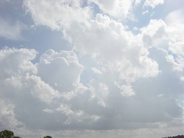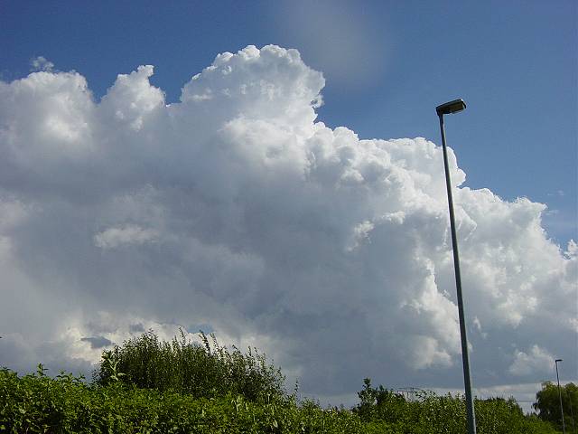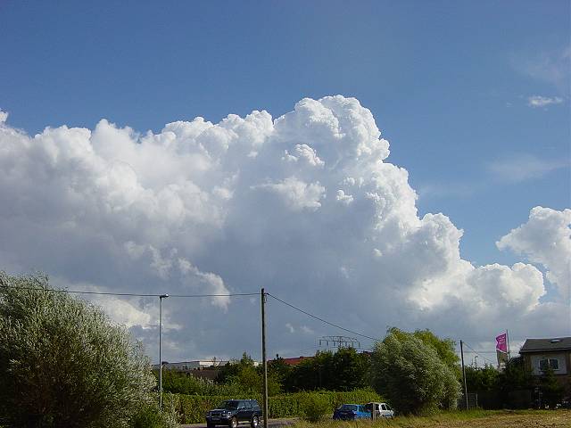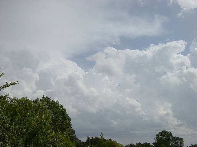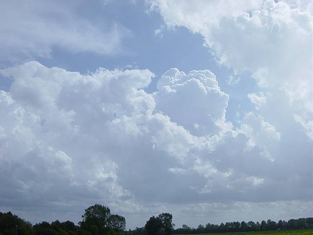 Als ich gegen 14:00 Uhr zurück fahren wollte, sah ich in südlicher Richtung beeindruckende Cumuluswolken. Auch die Geschwindigkeit in der diese Wolken anwuchsen war enorm. Kurze Zeit später lockerte die Bewölkung von Westen her auf und ich dachte, dass das schon wieder alles war... |