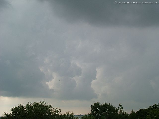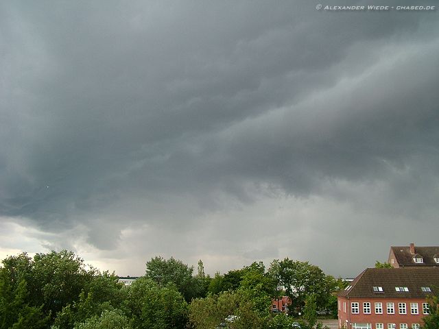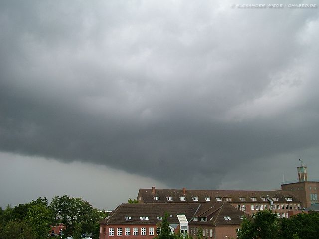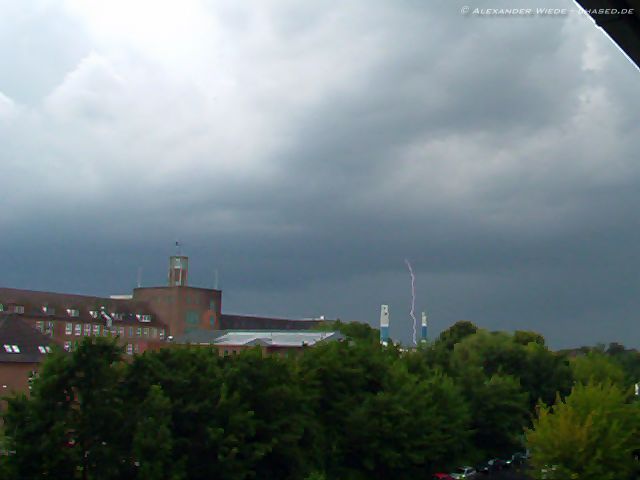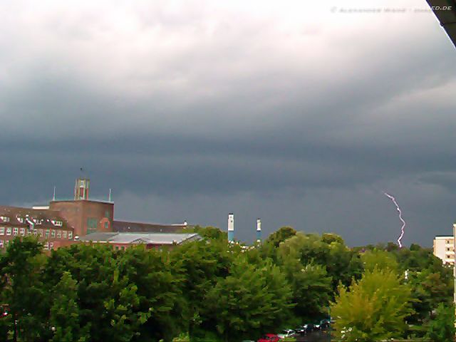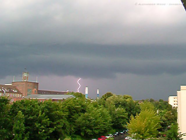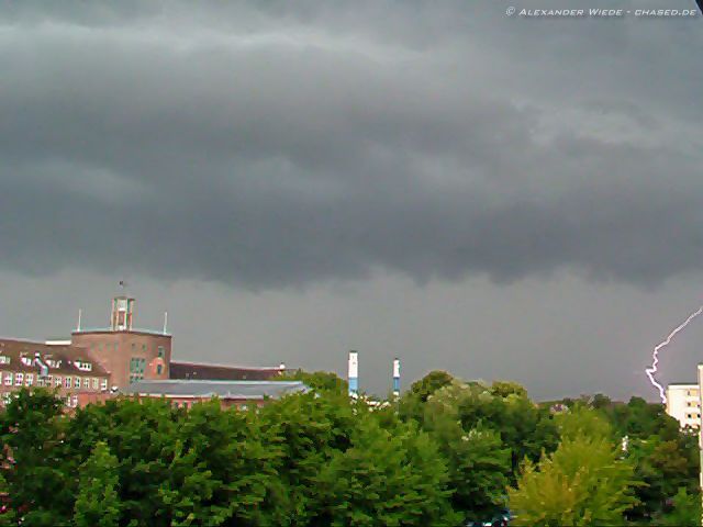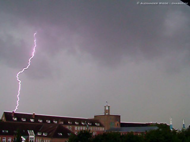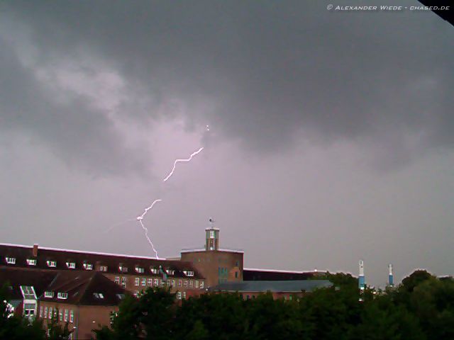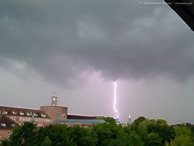 Als ich wieder zu Hause ankam, konnte ich auf dem Niederschlagsradar ein kräftiges Regenband beobachten, dass sich direkt von Westen her auf meinen Standort zu bewegte. Gegen 17 Uhr waren schon erste Blitze von meinem Balkon aus zu sehen. Es gab fast nur Erdblitze, leider habe ich die besten Videos aus mir unbekannten Gründen gelöscht, z.B. 4 Erdblitze nebeneinander und einen Nahblitzeinschlag ca. 200 m entfernt. Die Blitzaktivität lag für 15 Minuten bei 2 Blitzen pro Minute, ließ dann aber schlagartig nach und 5 Minuten später war keine Entladung mehr zu sehen.