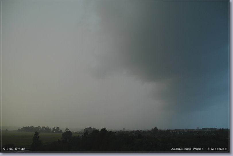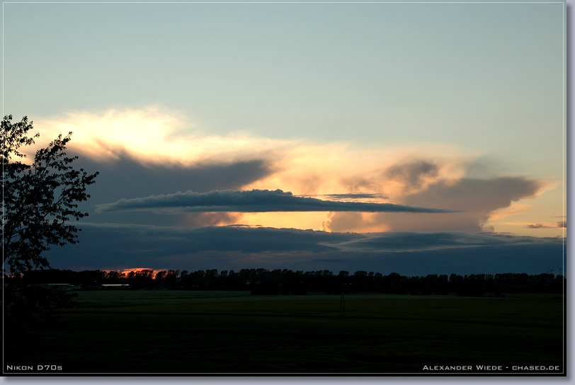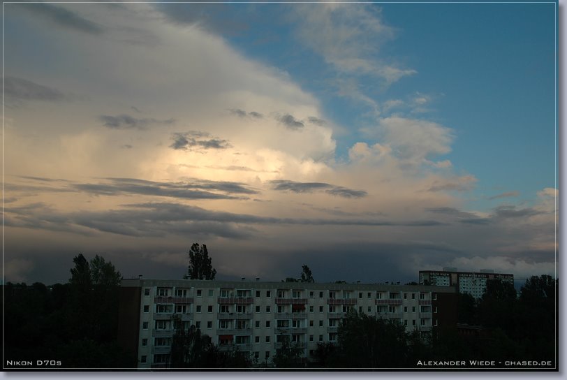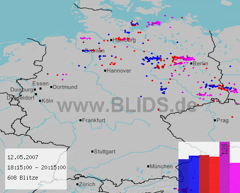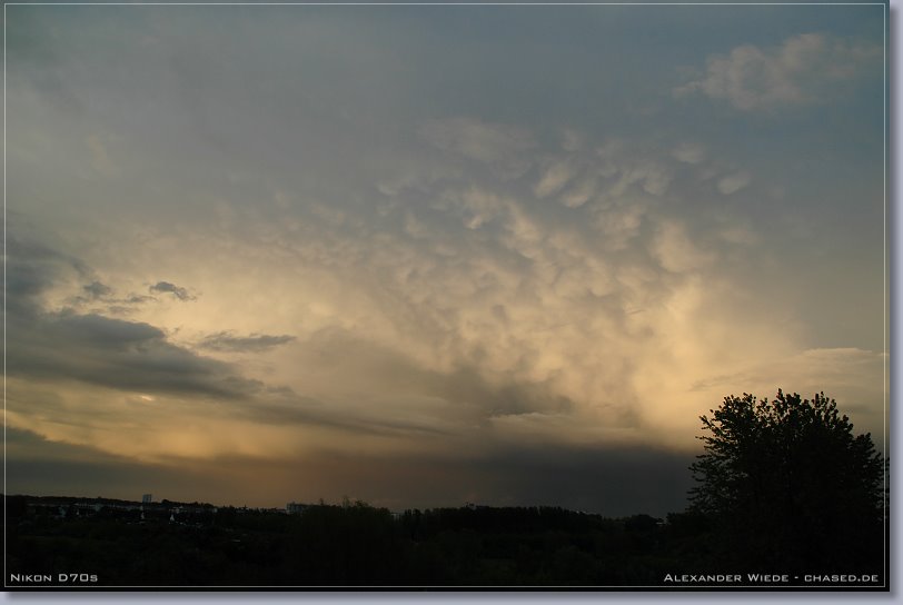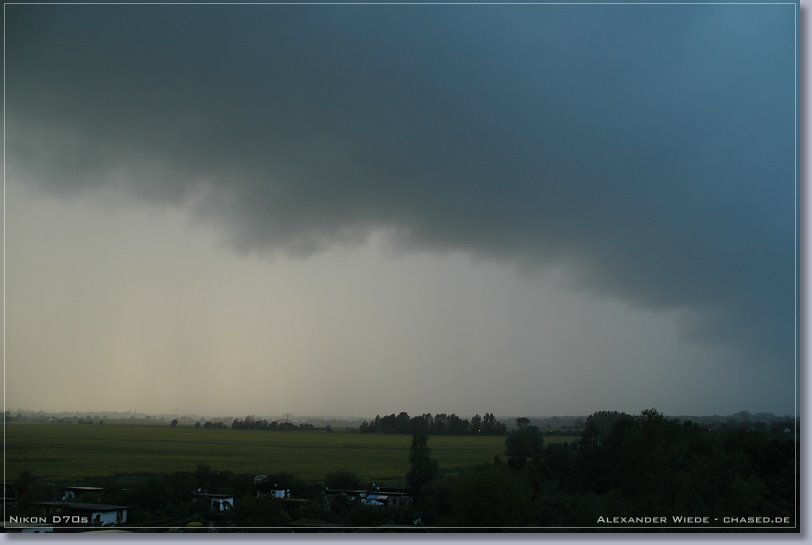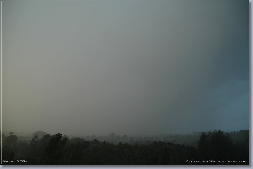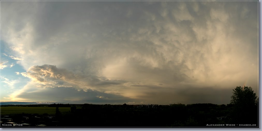 Gegen 16:00 Uhr hatte sich eine moderate Multizelle im Zusammenhang mit einer schwach ausgeprägten Okklusion eines von Südwest nach Nordost ziehenden Tiefs über Schleswig Holstein gebildet. Der Blitzspion verhieß nichts Gutes, da die elektrische Aktivität der Zelle bei Wismar langsam abklang. Jedoch sagte mir der Blick aus dem Fenster, dass hier doch noch was passieren könnte. Außerdem stelle ich seit geraumer Zeit fest, dass sich heranziehende Gewitter des Öfteren vor Rostock verstärken. Diese Entwicklung kommt mir natürlich zugute ;-). Und siehe da, gegen 20:00 Uhr hörte ich das erste Donnergrollen aus ca. 4 bis 5 km Entfernung. Danach ging alles ziemlich schnell: Die Blitzaktivität nahm rasch zu und erreichte ihr Maximum gegen 20:15 Uhr. Die Frequenz lag immerhin bei passablen 2 bis 3 Blitzen in 1 Minute. Als der Abwindbereich hereinbrach drehte der Wind schlagartig von Süd-Südwest auf Nordwest und die Temperatur viel von 16 °C auf 10 °C. Es gab heftigen Regen und Graupel bis Hagel von 0,5 cm Größe. Nach Durchzug der Front klarte es relativ schnell wieder auf und die Luft war extrem klar (20-30 km Weitsicht). Als Krönung bot sich mir die Rückseite des Systems mit wirklich beeindruckenden Mammatusstrukturen… Vielen Dank an Enrico - www.sturmjagd-mv.de (Siehe Bilder unten) Gruß Alex |