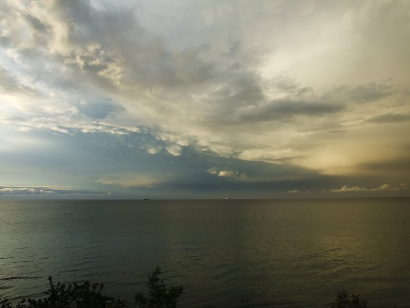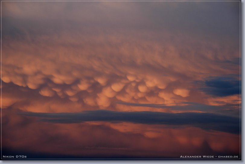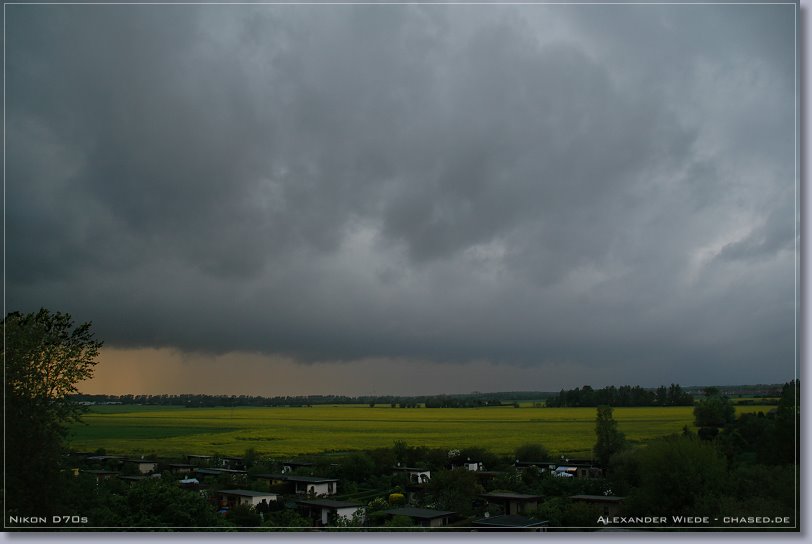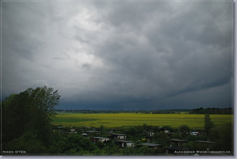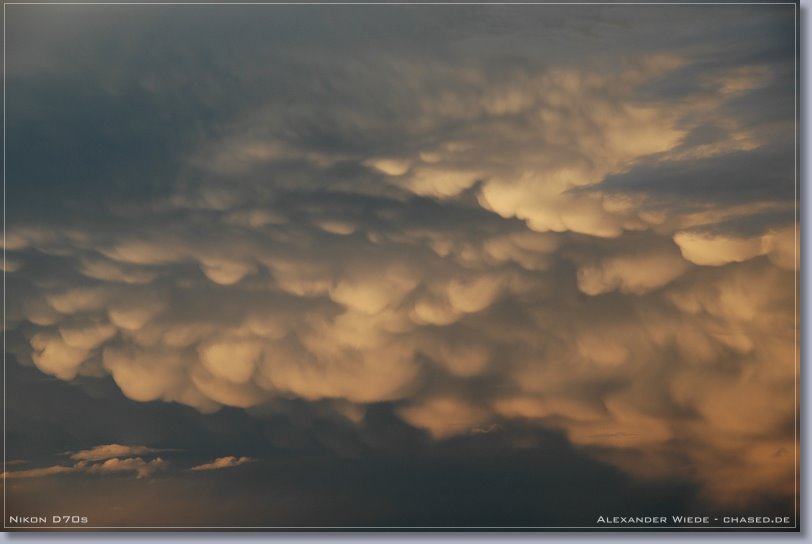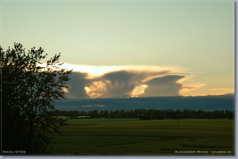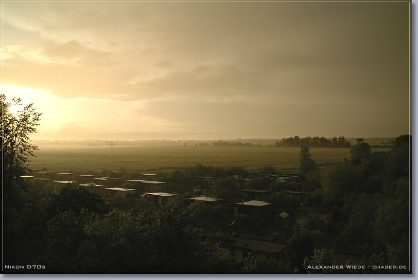 Gegen 16:00 Uhr hatte sich eine moderate Multizelle im Zusammenhang mit einer schwach ausgeprägten Okklusion eines von Südwest nach Nordost ziehenden Tiefs über Schleswig Holstein gebildet. Der Blitzspion verhieß nichts Gutes, da die elektrische Aktivität der Zelle bei Wismar langsam abklang. Jedoch sagte mir der Blick aus dem Fenster, dass hier doch noch was passieren könnte. Außerdem stelle ich seit geraumer Zeit fest, dass sich heranziehende Gewitter des Öfteren vor Rostock verstärken. Diese Entwicklung kommt mir natürlich zugute ;-). Und siehe da, gegen 20:00 Uhr hörte ich das erste Donnergrollen aus ca. 4 bis 5 km Entfernung. Danach ging alles ziemlich schnell: Die Blitzaktivität nahm rasch zu und erreichte ihr Maximum gegen 20:15 Uhr. Die Frequenz lag immerhin bei passablen 2 bis 3 Blitzen in 1 Minute. Als der Abwindbereich hereinbrach drehte der Wind schlagartig von Süd-Südwest auf Nordwest und die Temperatur viel von 16 °C auf 10 °C. Es gab heftigen Regen und Graupel bis Hagel von 0,5 cm Größe. Nach Durchzug der Front klarte es relativ schnell wieder auf und die Luft war extrem klar (20-30 km Weitsicht). Als Krönung bot sich mir die Rückseite des Systems mit wirklich beeindruckenden Mammatusstrukturen… Vielen Dank an Enrico - www.sturmjagd-mv.de (Siehe Bilder unten) Gruß Alex |