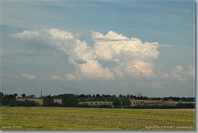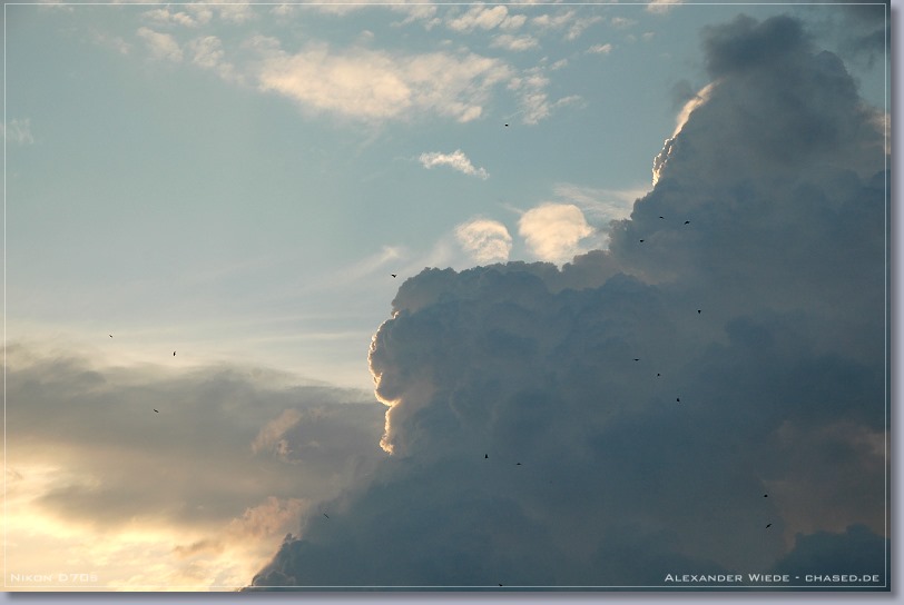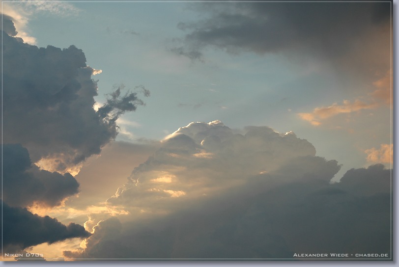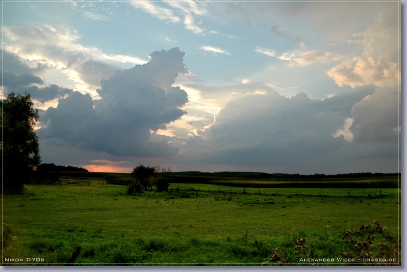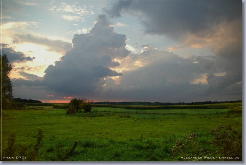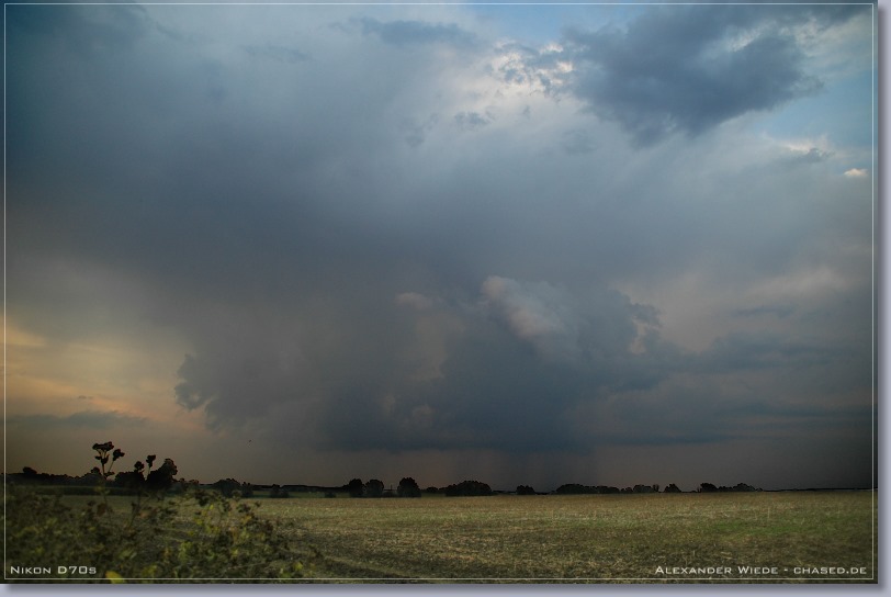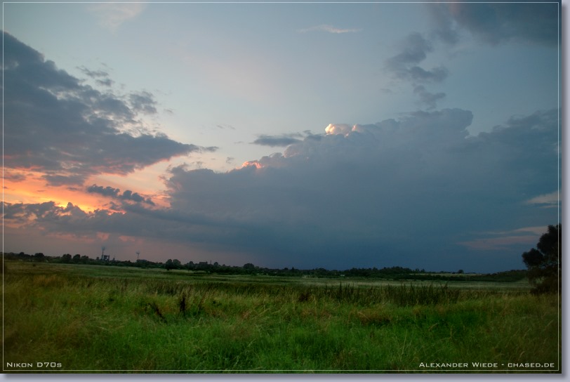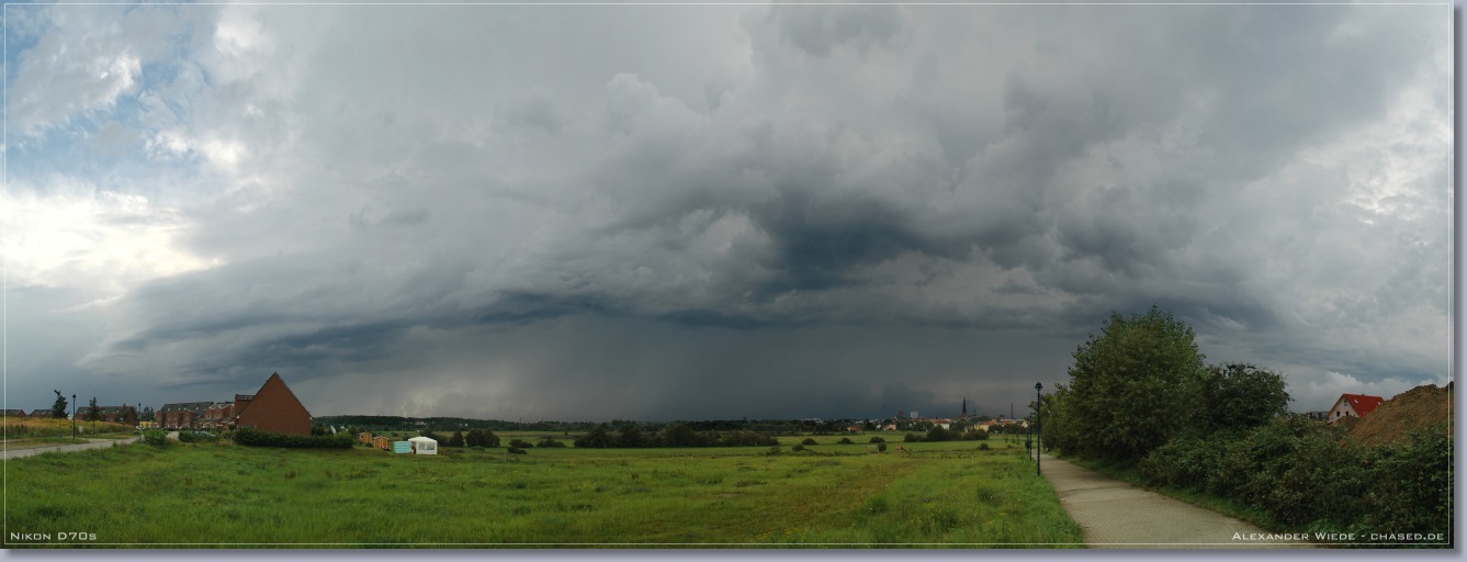 | Hallo, im Verlaufe des heutigen Tages stieg die Quellwolkenbildung bis gegen 17 Uhr stetig an. Jedoch ließ jede größere Wolkenbildung rasch nach, so dass es zu keiner Ausbildung von Zellen kommen konnte. Ab 18 Uhr wurde der Himmel mit Stratocumulus verdeckt, so dass ich meine Beobachtungstour abbrechen musste. Gegen 19:30 Uhr rief mich mein Kollege Enrico von nighty-production an und sagte mir, dass ein schmales Niederschlagsband mit straken, aktiven Kernen in meine Richtung zog. Ich startete darauf die zweite Tour des heutigen Tages und fuhr auf der A20 von Wismar aus Richtung Osten, also dem Band entgegen. Enrico Beobachtete das System von der anderen Seite aus und bekam sogar eine Wallcloud zu gesicht - Siehe Bericht Enrico. Nachdem sich der erste Kern kräftig abgeschwächt hatte, bauten sich Richtung Nordwest zwei Türme auf, die sich später zu einem Blitzaktiven Gewitter verstärkten. Leider war es noch etwas zu hell, so dass ich die teilweise aus dem oberen Wolkenbereich zur Erde zuckenden Blitze nicht aufnehmen konnte. Jedoch war das ein schöner Abschluss des heutigen Tages… Das vorletzte Panorama habe ich am 22.08. aufgenommen. An diesem Tag gab ab 16 Uhr eine starke Gewitterentwicklung im nördlichen Mecklenburg-Vorpommern. Jedoch konnte ich das dann entstehende und 2 ˝ Stunden andauernde Gewitter nicht weiter dokumentieren, da es mal wieder zu heftiger Nebelentwicklung kam. In dieser Saison war jedes zweite Gewitter in Rostock ein Nebelgewitter, mit Sichtweiten zum Teil unter 50 m. Also eher eine schlechte Gewittersaison, wenn man bedenkt, dass es dieses Jahr nur 5 oder 6 Gewitter bis jetzt in Rostock gab. Gruß Alex |