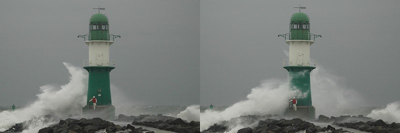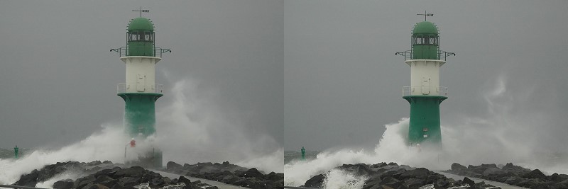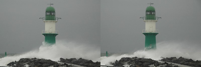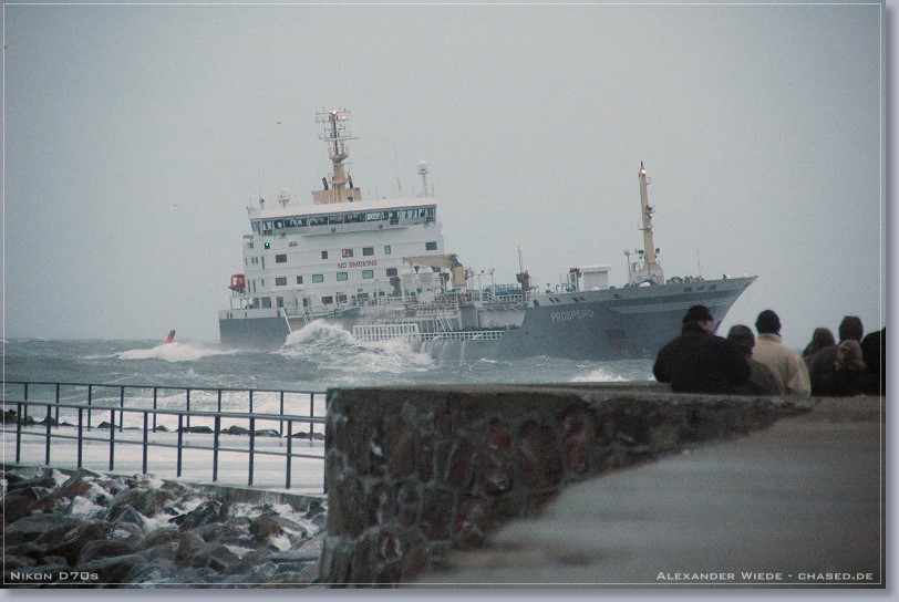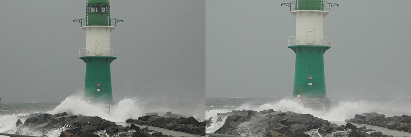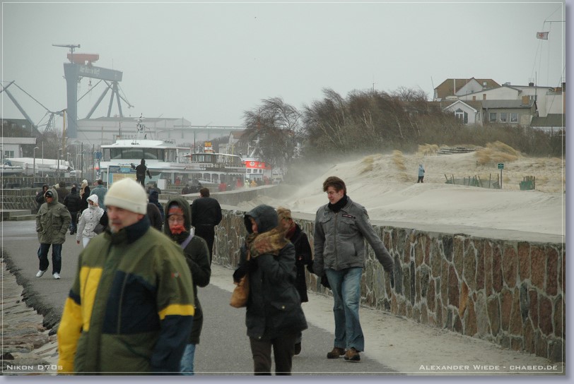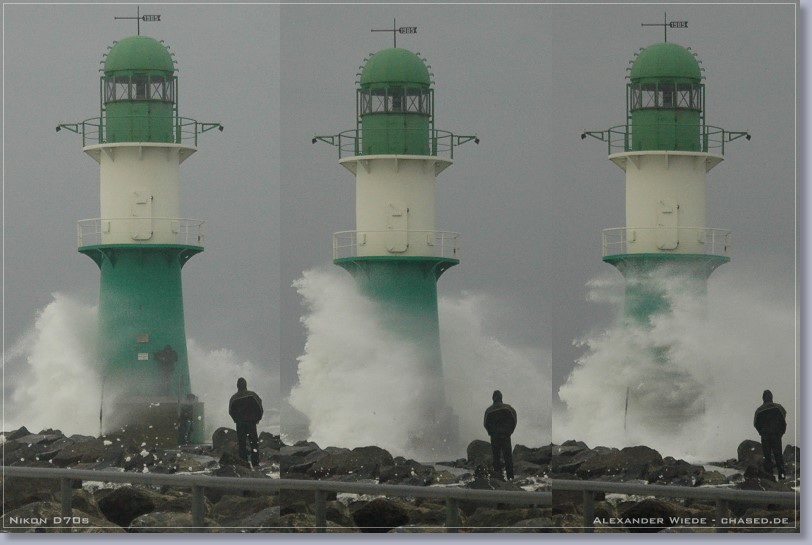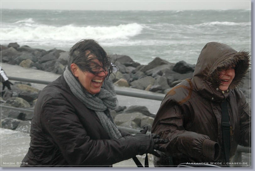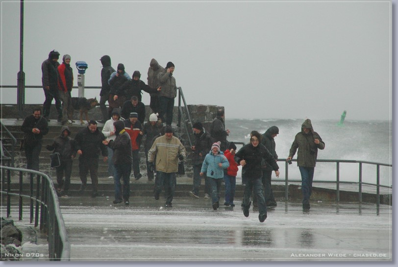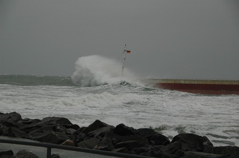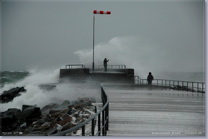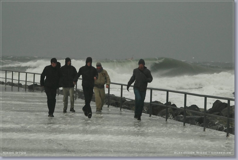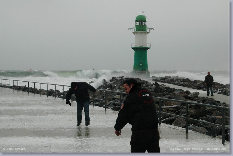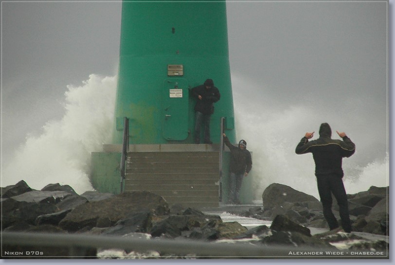 | Hallo, nachdem Tief Emma am heutigen Vormittag schon in weiten Teilen Deutschlands für orkanartige Böen und Orkanböen gesorgt hat, kam das heftigste Windfeld in Mecklenburg Vorpommern erst gegen 15 Uhr an. Am Vortag fiel hier der Luftdruck rapide von 1020 auf 990 hPa innerhalb von 10 Stunden. Heute gegen 6 Uhr erreichte der Luftdruck dann sein Minimum von 974 hPa und stagnierte dann bis etwa 15 Uhr. Der Luftdruckanstieg dann war eher nicht außergewöhnlich stark, jedoch legte der Wind ordentlich zu und blies mit 8 Bft aus West 290°. Ich machte mich dann auf nach Warnemünde... Etwa gegen 17 Uhr erreichte der Wind dann im Mittel volle Sturmstärke 10 mit orkanartigen Böen (108 km/h Wetterstation Warnemünde). Auf der offenen See gab es schätzungsweise eine 11 mit Böen um 12 Bft. Dem entsprechend ging ziemlich viel ab auf dem Wasser... Lustig wurde es auch - es gibt immer wieder Leute die die Kraft der Wellen nicht einschätzen können (siehe die Bilder unten). Das hätte auch ins Auge gehn können! Gruß Alex |