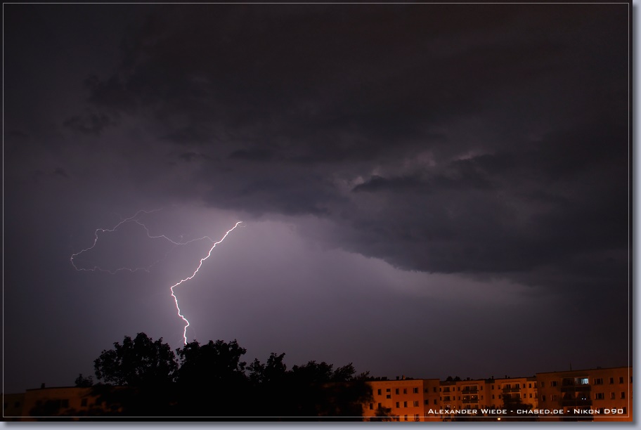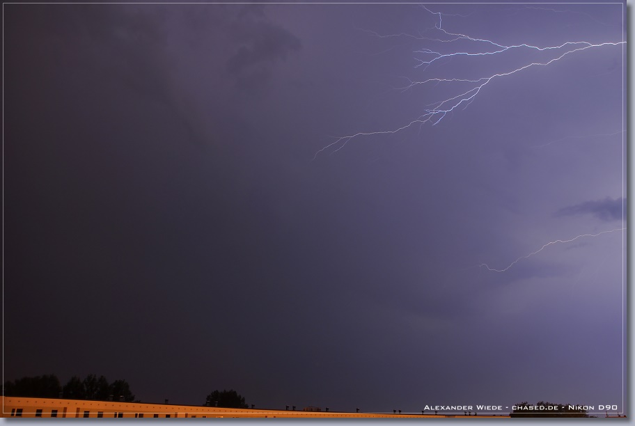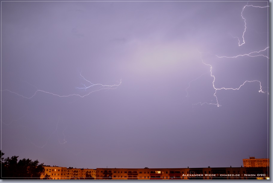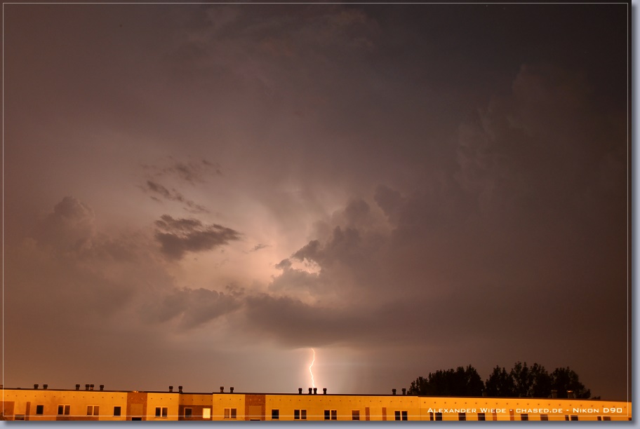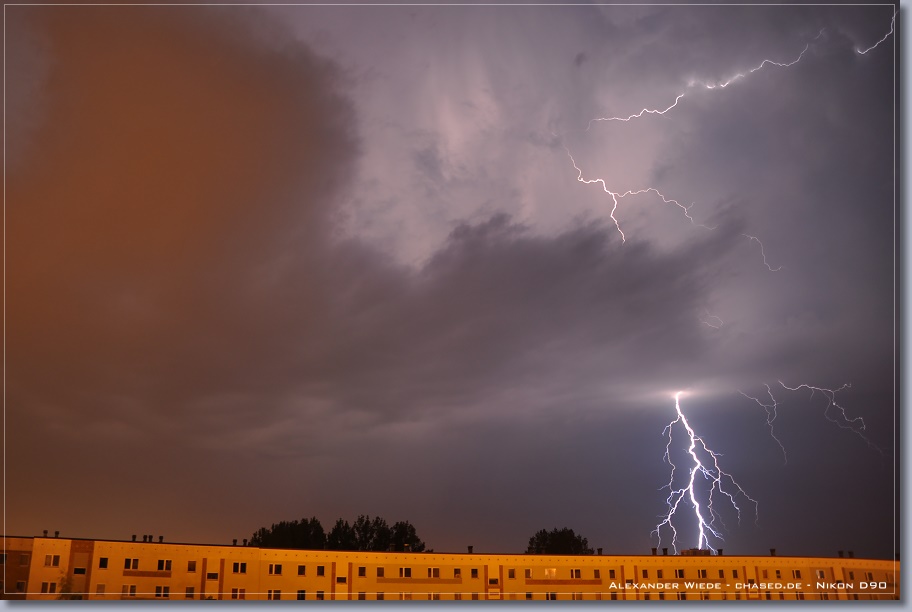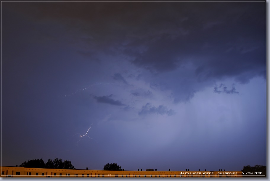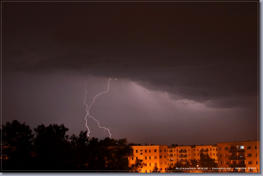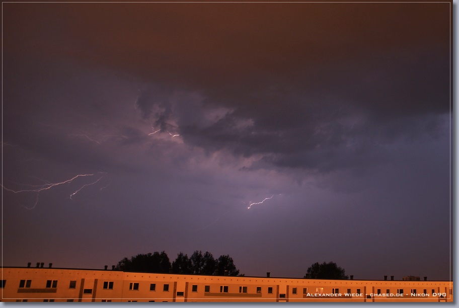 | Hallo, nach nun zwei Jahren wird es endlich mal wieder Zeit für einen neuen Bericht auf chased.de. In der Nacht zum 14. Juli gegen 2:00 Uhr erreichte Rostock ein Gewittercluster, der sich am Vorabend in der Mitte Deutschlands gebildet hatte. Zu meinem Glück versterkte sich eine frische, eingelagerte Zelle südlich vor Rostock, so dass ich folgende Aufnahmen machen konnte. Die beiden ersten Bilder entstanden am 11.07. - An diesem Tag gab es einige kurzlebige Zellen. Der Schwerpunkt der Gewitteraktivitäten spielte sich jedoch weiter westlich ab... Gruß Alex |