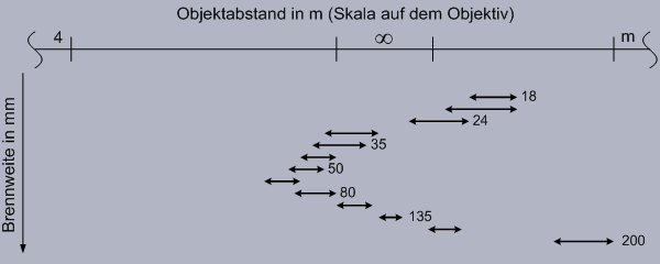Voraussetzungen: Folgende Dinge sollten vorausgesetzt werden, bevor es zu den eigentlichen Aufnahmen geht. Vorbereitungen zum richtigen Fokus: An erster Stelle sollte bei Tageslicht geprüft werden, welche Fokuseinstellungen notwendig sind, damit der Blitz auch wirklich scharf aufgenommen werden kann. Denn in der Dunkelheit ist es sehr schwierig, mit Hilfe des Autofokus scharf zu stellen. Normalerweise sollte bei der manuellen Fokuseinstellung die Einstellung "Fokus unendlich" zu einer optimalen Darstellung aller Objekte in einer Entfernung von mehr als 500 m, also der meisten Blitze, führen. Aufgrund eigener Erfahrungen ist dies jedoch nicht immer der Fall. Das heißt, trotz der Einstellung "Fokus unendlich" kann es zu unscharfen Bildern kommen. Ich empfehle deshalb, gerade bei einem Zoomobjektiv für DSLR, ein individuelles Fokusdiagramm zu erstellen. Hierbei kann wie folgt vorgegangen werden: Bei Tageslicht wird ein Objekt am Horizont unter Variation der Brennweite mit Hilfe des Autofokus fokussiert und bei den einzelnen Brennweiten die Stellung des Fokus notiert bzw. skizziert. Das Ganze kann dann z.B. so aussehen: