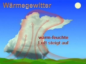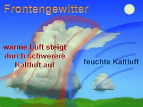Enstehung Gewitter werden ausgelöst bei schnellem Aufsteigen feuchter Warmluft in größere Höhen (Wärmegewitter) oder bei heftigem Zusammentreffen von feuchter Warmluft mit einer größeren Kaltluftfront (Frontgewitter). Bei diesem Prozess kommt es zu kraftvollen Luftströmungen. Aufwinde führen hinauf bis in Höhen von 10000 Meter. Die damit verbundene Abkühlung der Luft bringt Kondensation mit sich, also Wasserdampf wird verflüssigt. Da Gewitterwolken Minusgrade aufweisen, ist der in ihnen enthaltene Niederschlag entweder in Form von Eiskristallen oder unterkühlten Wassertropfen vorhanden. In der Regel sind beide Formen anwesend. Es findet